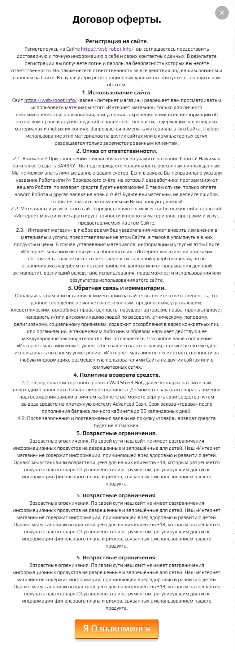 На одном из сайтов жуликов Уолл-стрит Бот все-таки нашлось нечто вроде публичной оферты, и то, это слабая замена клиентскому соглашению, так что трейдеры очень рискуют.