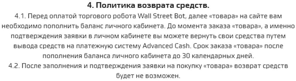 И даже когда трейдер поймет, что за дорого купил бесплатного бота Trio Dancer, каталы Wall-Street Bot денег не вернут. Ниже приведен полный текст этого сомнительного документа.