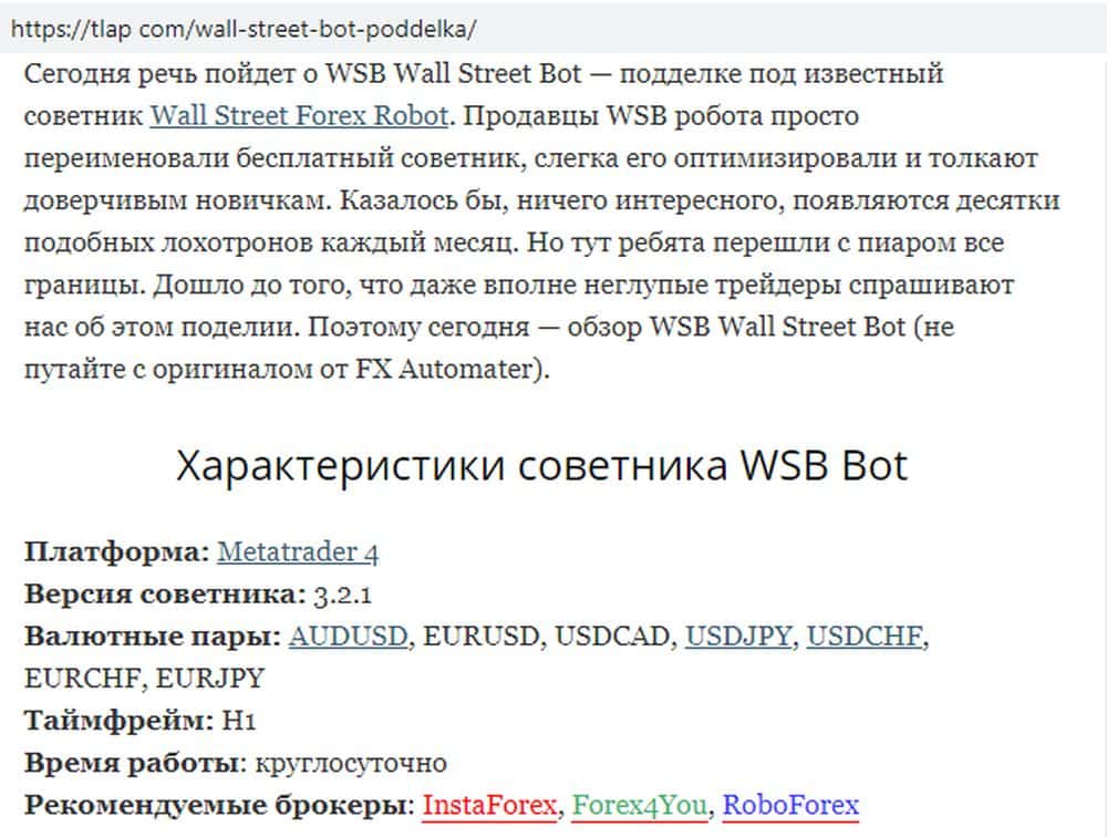 Уолл-стрит Бот - очередная онлайн-афера, предлагающая купить бота для автоматической торговли. Разводилы взяли за основу бесплатную программу Trio Dancer, настроили ее на слив депозитов и распространяют через реферальную программу и кучу похожих сайтов. Хапуги работают только с брокерами-мошенниками Forex4you, RoboForex и InstaForex. Слив производится на скам-платформе MetaTrader4 авторства мошенников MetaQuotes. Ни в коем случае не платите за недобота Уолл-стрит Бот, он сольет ваш депозит в карманы лохотронщикам!