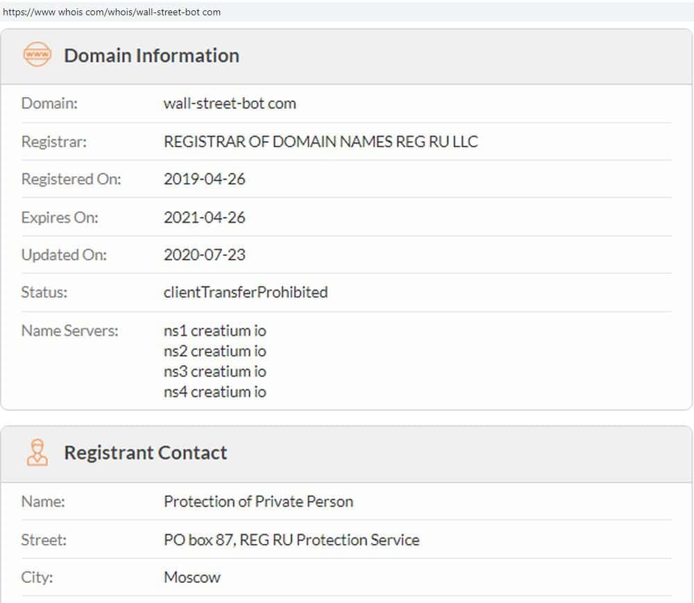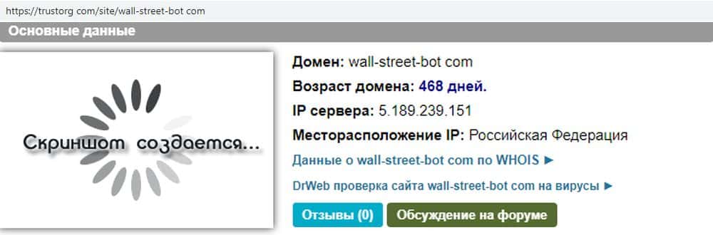 Согласно интернет-ресурсу трасторг ком, домен шарлатанов Уолл-стрит Бот существует уже больше года - но это не значит, что они работают долго, доменное имя могли перекупить.