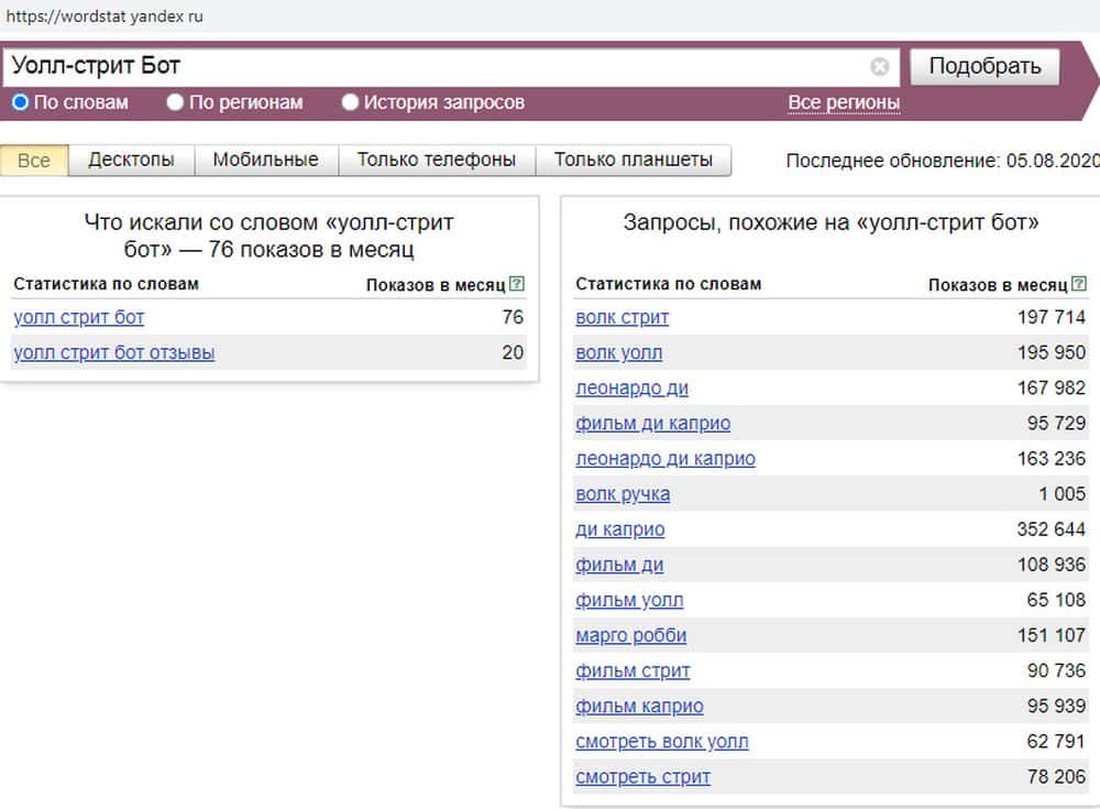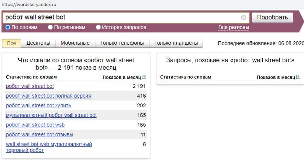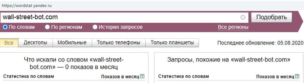 Лохотрон Уолл-стрит Бот не особо популярен по своему русскому названию. По запросу "Уолл-стрит Бот" Яндекс.Вордстат выдал 76 показов, еще 20 человек пытались найти отзывы.