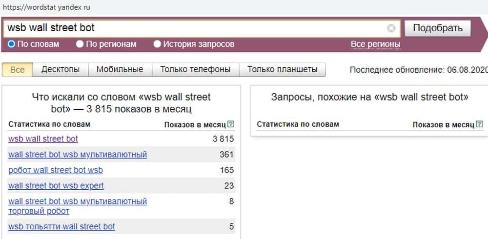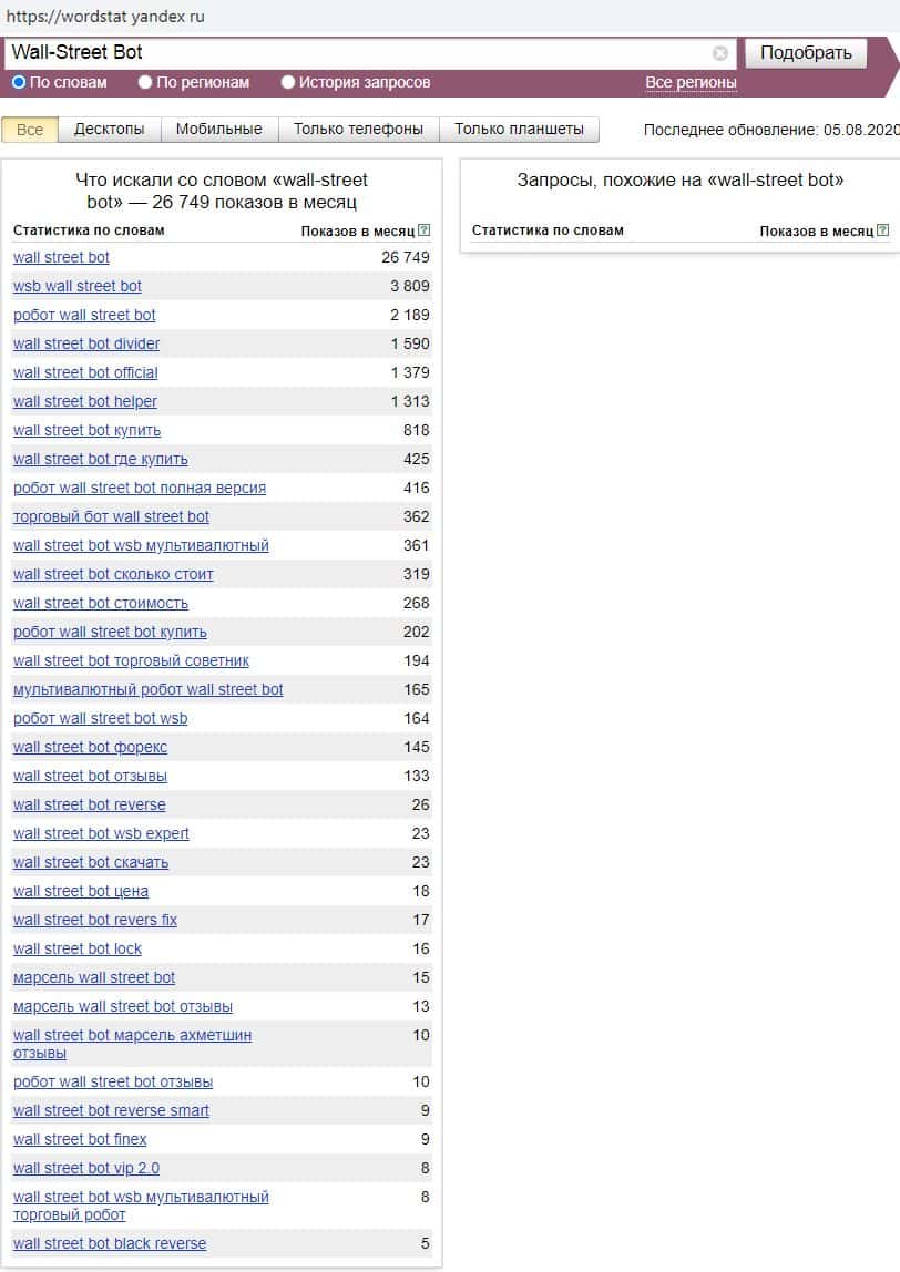 Иногда люди ищут лохотрон Уолл-стрит Бот по запросу "wsb wall street bot" - около 4000 показов за месяц в яндекс, и снова люди пытаются найти отзывы реальных трейдеров.