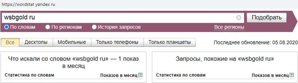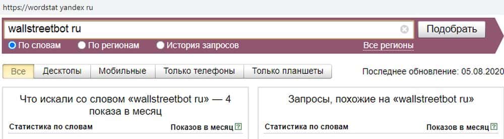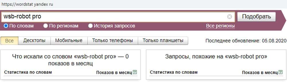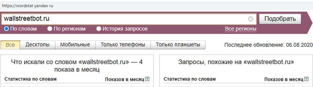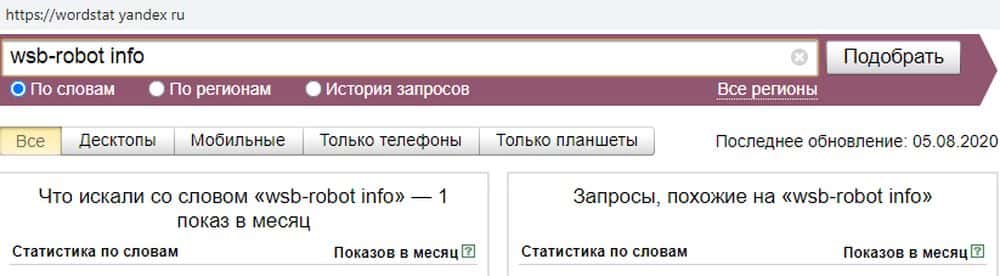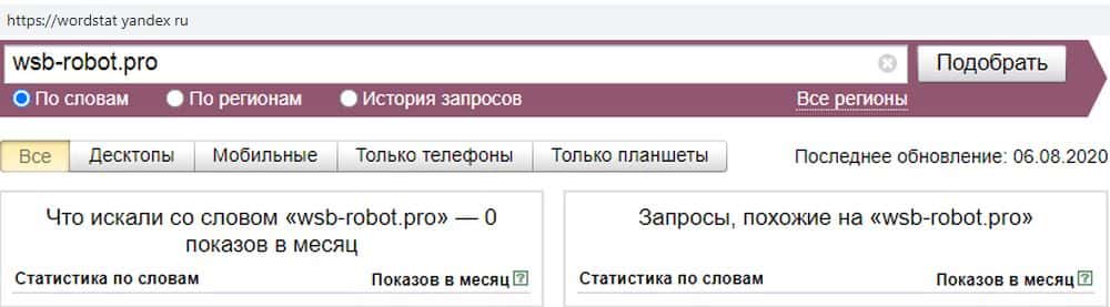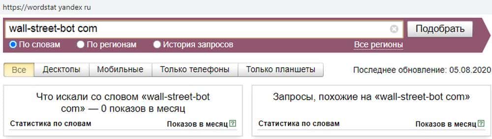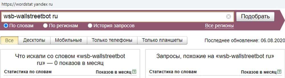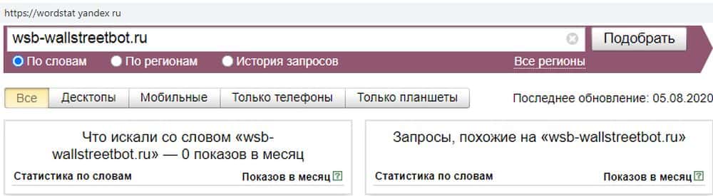 То же касается запроса "wsb-wallstreetbot ru" - 0 показов. Этот клон аферистов Уолл-стрит Бот мало кого интересует, и только создает "массовку", чтобы проект казался солиднее.