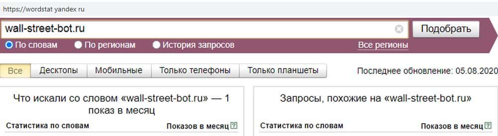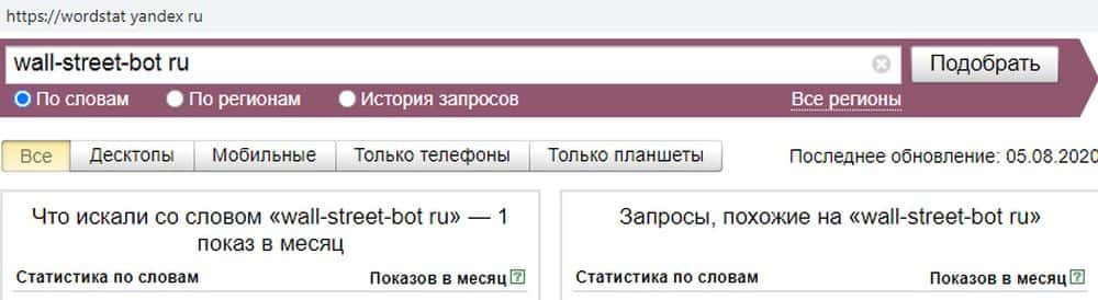 По запросу "wall-street-bot.ru" с точкой результат - один показ за месяц. Карина была бы другой, если бы скам-бот Уолл-стрит Бот правда был так популярен, как утверждают разводилы.