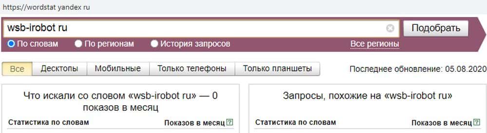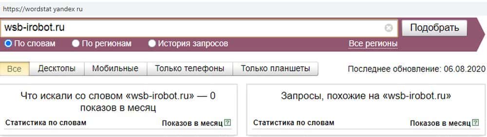 Следующий домен мошенников вообще никто не ищет. По запросу "wsb-irobot ru" показов за месяц не было, что говорит об убогости этого сомнительного онлайн-лохотрона.