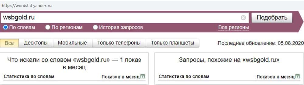 Запрос с точкой "wsbgold.ru" результатов также не дает. Этот домен с лохотроном Уолл-стрит Бот на нем не привлекает трейдеров - все понимают, что это сплошной обман.
