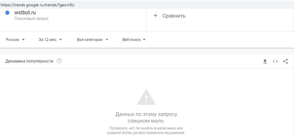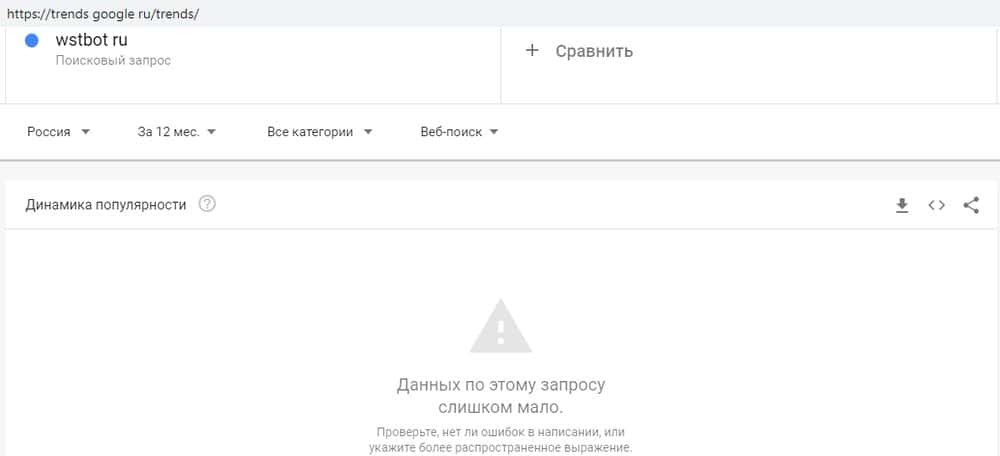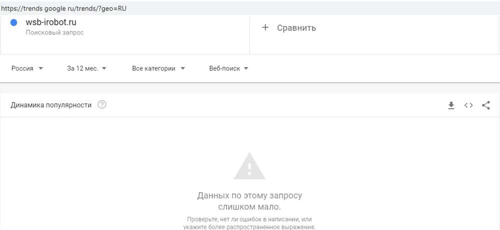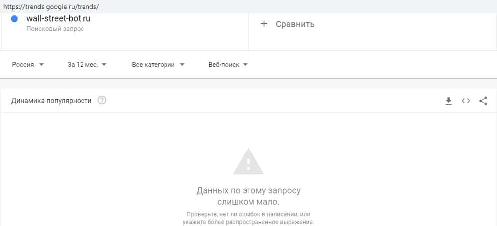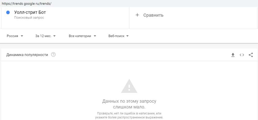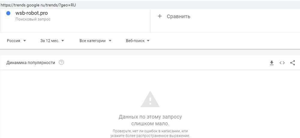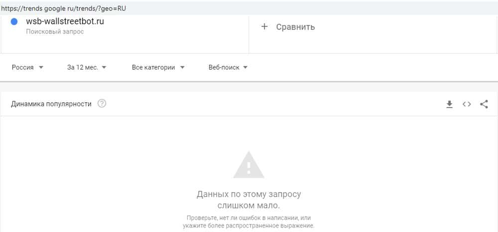 Проверка того же домена с точкой дает аналогичный результат. По запросу "wsb-wallstreetbot.ru" слишком мало данных, так что Трендз Гугл не может сформировать график.