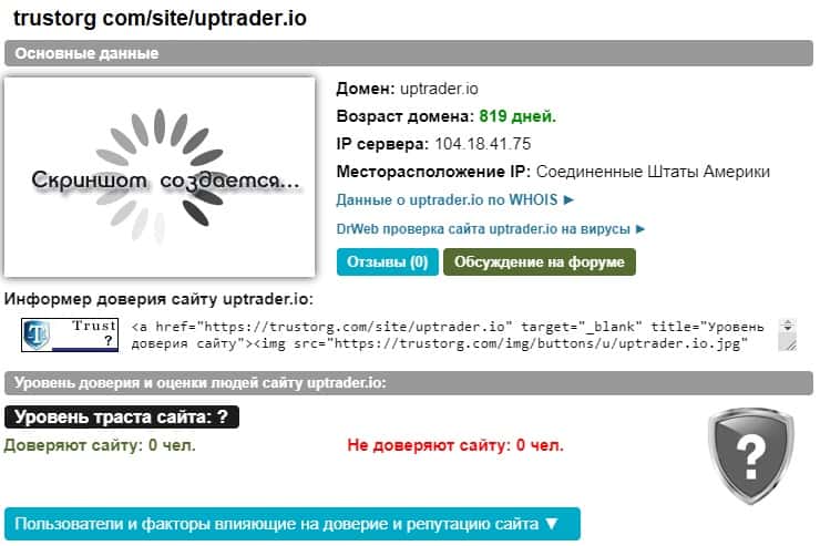 Проанализировав просторы глобальной сети, сложно найти информацию о лоховозке UpTrader io. На известном сайте Доверие в Сети нет никакой информации. В принципе, как и везде. Видно такие сайты мешают мошенникам, и они тщательно их зачищают. Берегитесь жуликов такого рода.
