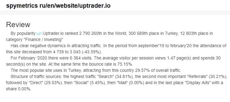 Еще один известный сайт "Маркетинговая разведка" провел анализ посещения сайта жулика Ап Трейдер. Как они заявляют, сайт мошенников становиться менее популярный. Посещать его стали в разы меньше, а если кто и заходил, то находится на нем не больше тридцати секунд. Значит и страдать от них стало меньше людей.