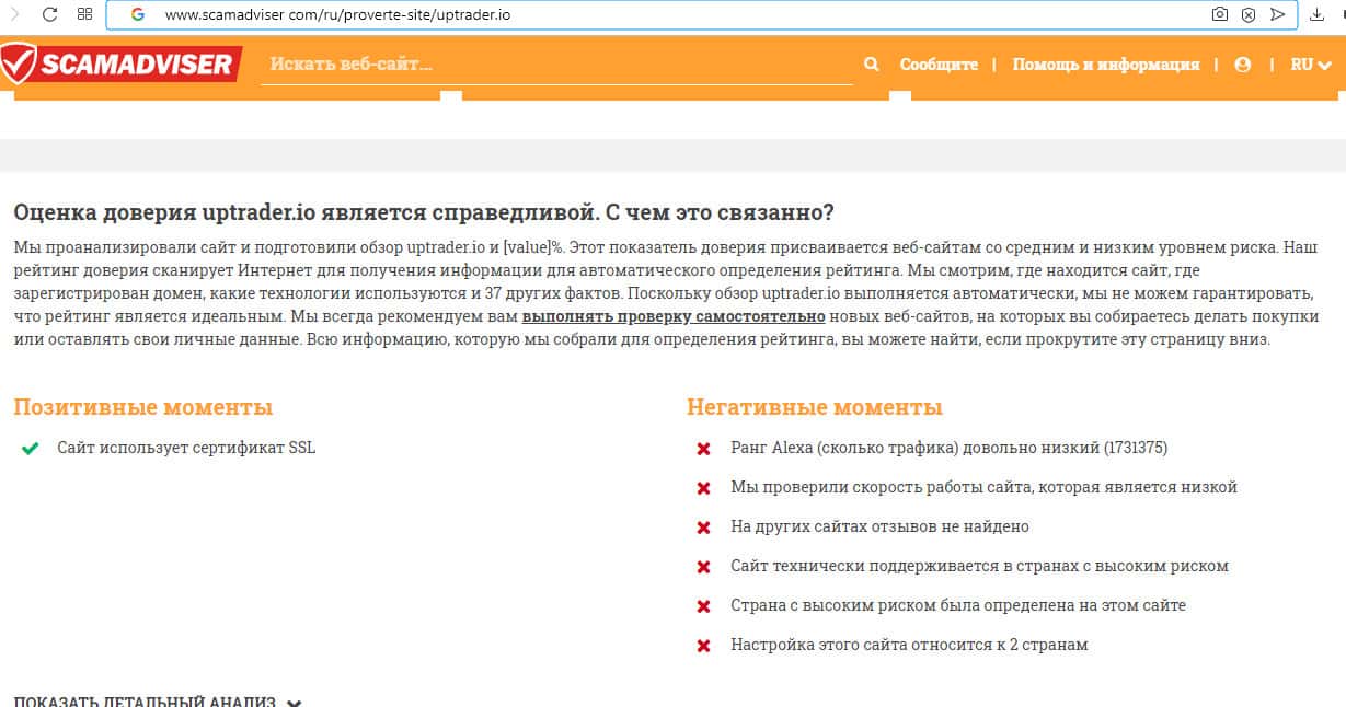 Scamadviser в своем обзоре лоховозки Ап Трейдер находит шесть негативных моментов и только один положительный, о котором можно еще поспорить и проверить. В обзоре они находят такие негативные моменты как: низкая скорость, отсутствие отзывов, настройка сайта находиться в двух странах с высоким риском.