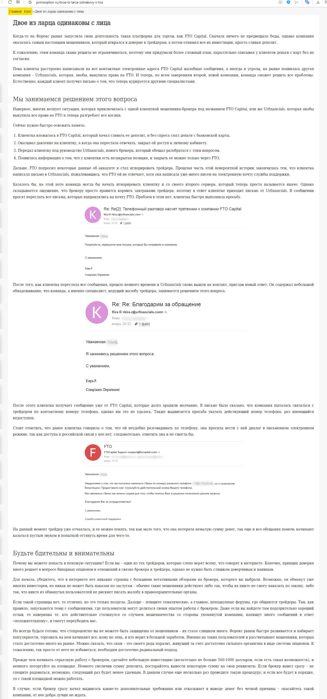 Далее представлена статья, в которой рассказывается о тесной связи конторы УР Файнэншилс и лохотоном FTO Capital. Если копнуть глубже то становится понятно, что это одна и та же компания, так как много что сходится в плане оформления, а также схемах развода. Так что не ведитесь на тех же разводил, только теперь в новой обвертке.