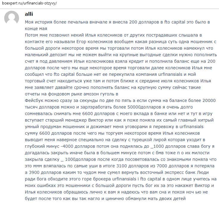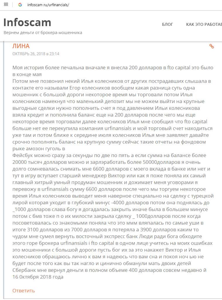 Данная печальная история произошла с одной женщиной, которая доверилась мошенникам и вложила 200 долларов. Аферюги УР Файнэншилс на то время работали под прикрытием конторы ФТО Капиталс, поэтому занимались кидаловом от их имени. Таким образом им удалось выманить почти 7000 долларов, которые жертва взяла в кредит.