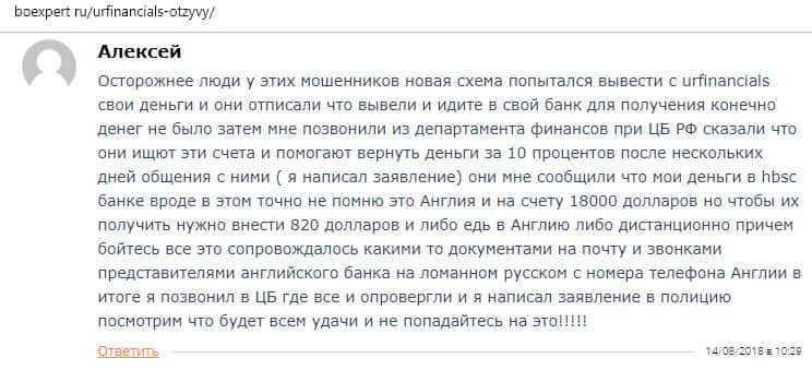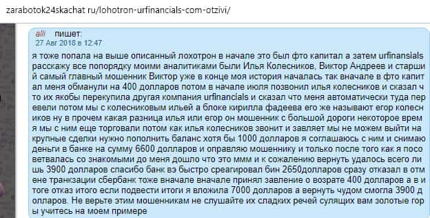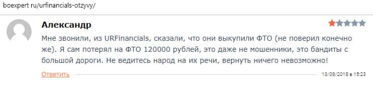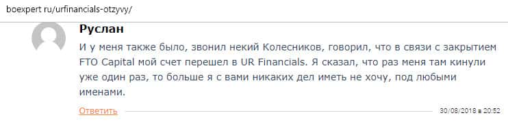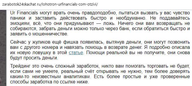 Еще один человек рассказал как ему теперь морочат голову менеджеры UR Financials и предлагают сотрудничать с ними, так как до этого жертва попался на лохотрон FTO Capitals, где потерял не маленькую сумму денег. Аферисты предлагают вложить теперь деньги в их контору и только тогда они запустят процесс помощи в возврате украденного.