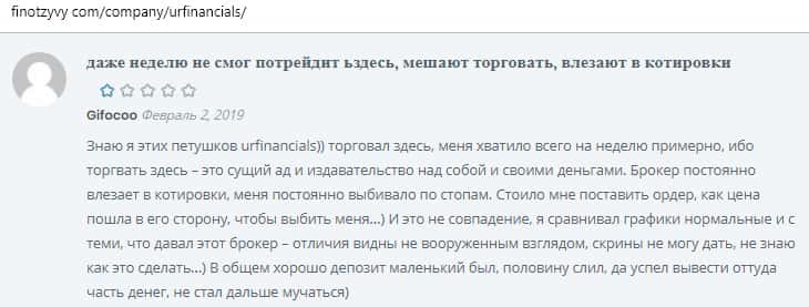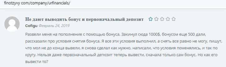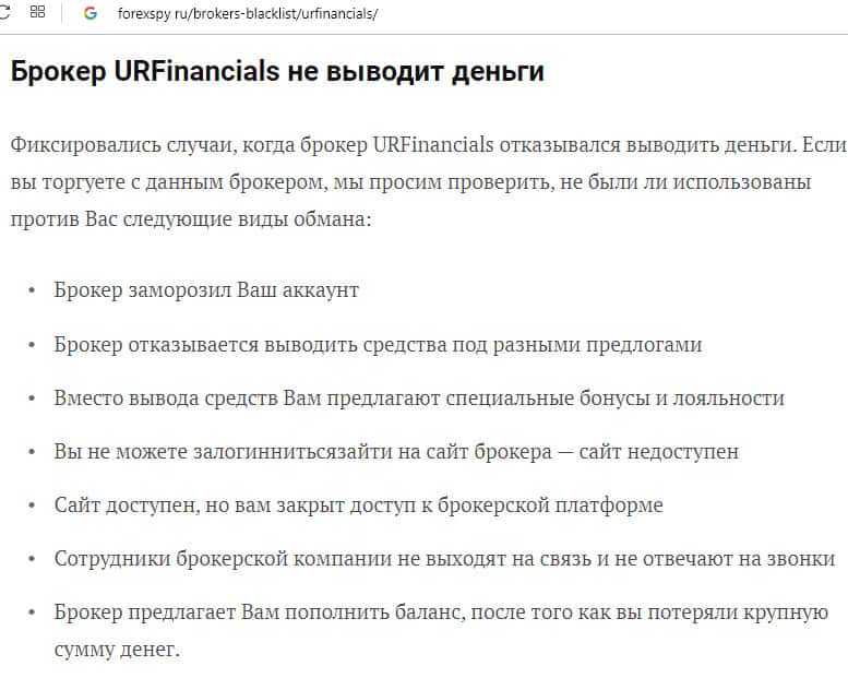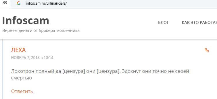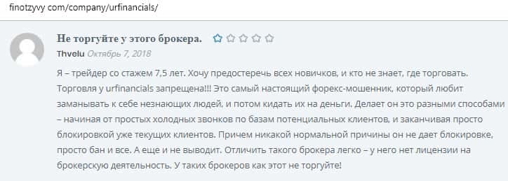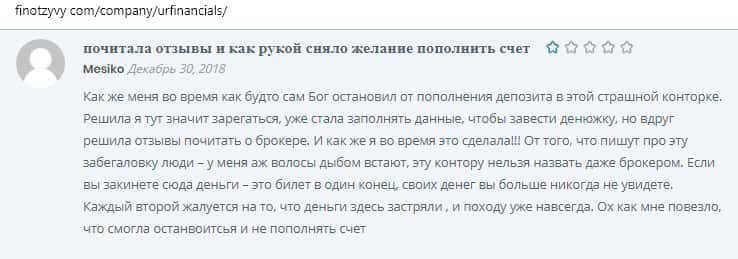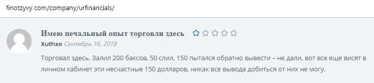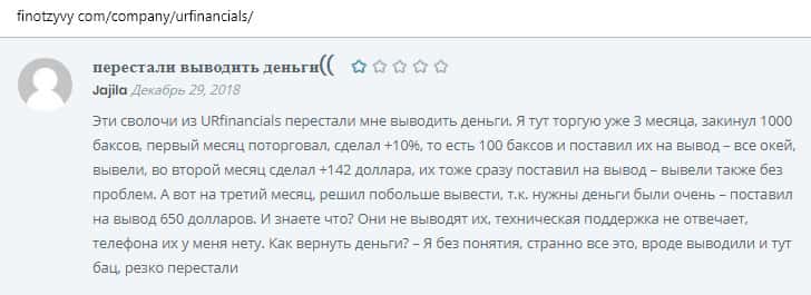 По словам автора аналитической статьи, на их ресурсе фиксировали случаи, когда брокерская контора УР Файнэншилс отказывался выводить деньги своим клиентам, при чем по разным причинам: то ли замораживают аккаунт и нет к нему доступа, то ли просто блокируют айпи и невозможно зайти даже на их сайт.