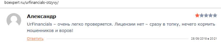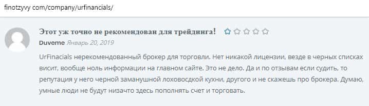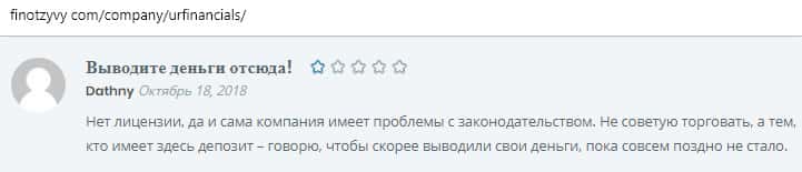 По словам очередного интернет-пользователя, контора УР Файнэншилс не имеет лицензии и не регулируется никаким финансовым регулятором. Аферисты имеют также проблемы с законодательством. Человек не советует торговать с ними, а, те кто уже вложил деньги, следует немедленно выводить все обратно.