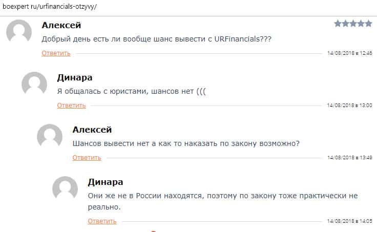 Один интернет-пользователь задает вопрос на форуме: "Есть ли шансы вывести средства из конторы UR Financials?". Но к сожалению другие участники беседы его обнадежили, так как некоторые из них обращались и в полицию, и к юристам, и там сказали, что это все безнадежное дело - ловить воров.