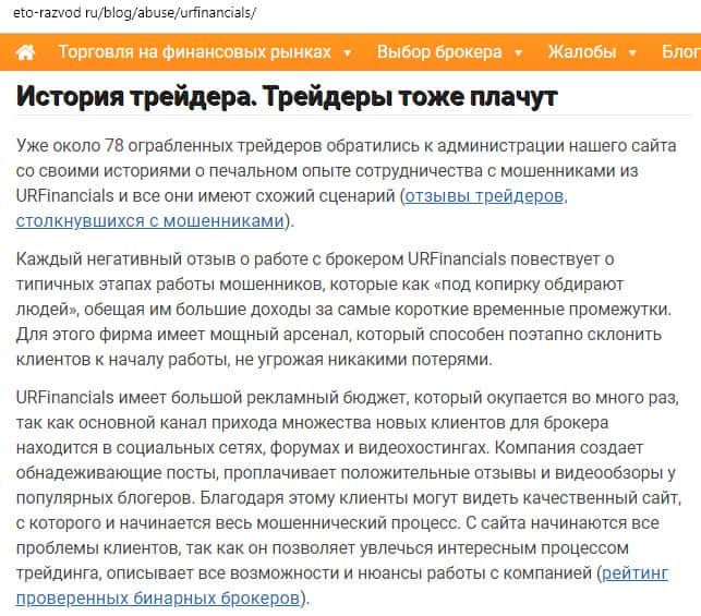 Уже свыше 78 жалоб администрация ресурса eto-razvod ru получила от людей, которых кинула брокерская контора UR Financials. Мошенники украли деньги уже у достаточного количества людей, так как работают под копирку по заезженной схеме, которая работает в последнее время довольно эффективно.