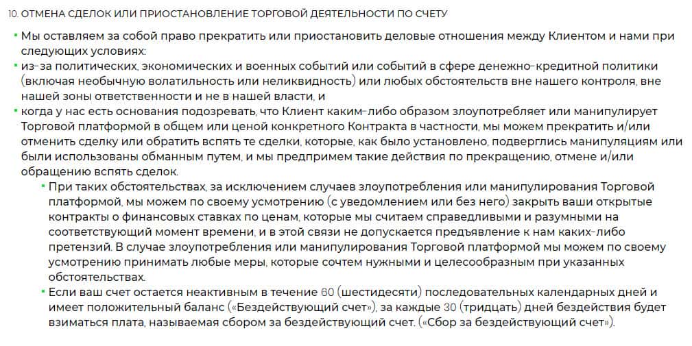 В договоре аферистов UR Financials также не все гладко как кажется, потому что жулики всегда оставляют юридические лазейки, чтобы как можно ловче выйти сухими из воды и ни за что не отвечать. Там есть такой раздел как отмена сделок и приостановка торгов клиента. Согласно нему, жулье имеет право закрыть доступ к счету без объяснения причин.