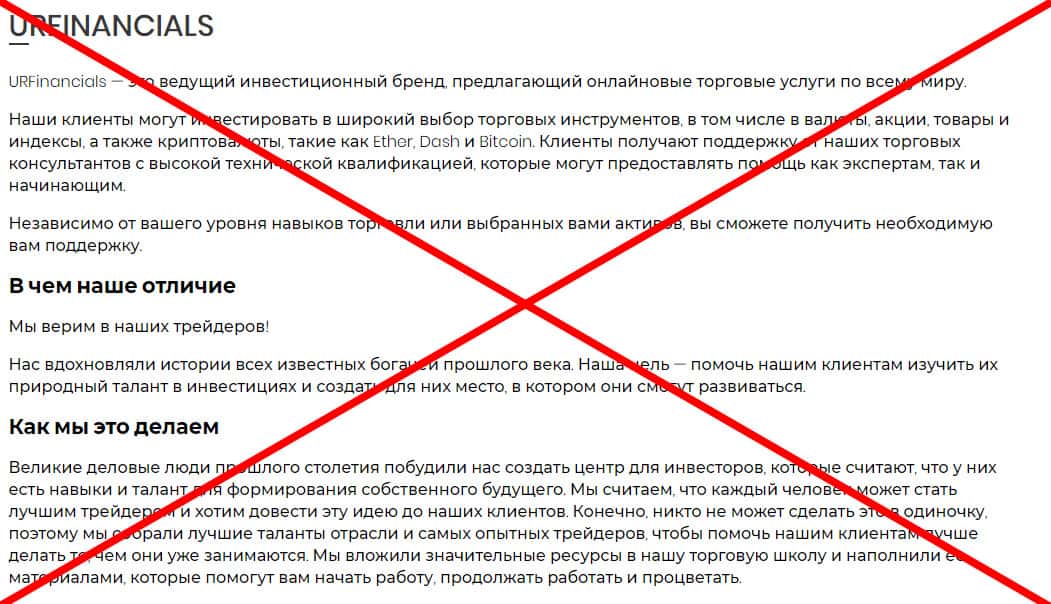 В данном отзыве рассказана правда, что вас ожидает сотрудничества с конторой UR Financials, потому что вы здесь потеряете не только деньги, а и потрепют вам нервы и потеряете время. Основная цель создания данного лохотрона - это собрать с наивных лохов как можно больше денег.