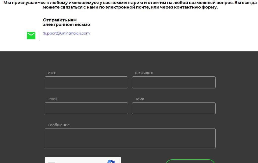 Из контактных данных, которые оставила контора УР Файнэншилс у себя на сайте, можем выделить только электронную почту и форму для обратной связи. Таким образом вы не сможете оперативно связаться с технической поддержкой, для быстрого решения проблемы и за это время вы можете потерять все. А вот собственно и сам контакт: