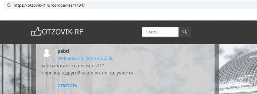 Клиент компании аферистов US11 написал отзыв о том, что не разберётся как работает кошелёк, так же он сообщил, что не удаётся сделать перевод на другой кошелёк, и это не удивительно, ведь если деньги попали в руки жуликов, то они там и останутся, так как компания не намерена возвращать их, а будут только тянуть больше.