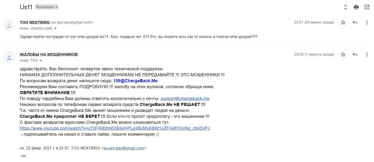 Ниже представлен скриншот первоначального письма, в котором описана схема мошеннического лохотрона ЮС11.