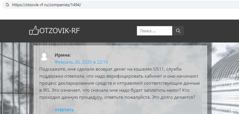 Вот один из честных отзывов о лохотроне US11 который компания не успела удалить. В нем пользователь говорит о том, что вся фирма это ложь, развод и провокация, так как требуют платить какие то налоги, только не понятно за что, так как это криптовалюта, и какой может быть налог на неё. А компания просто зарабатывает на таких наивных клиентах, которые платят эти налоги.