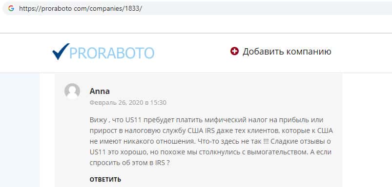 Пользователь ознакомившись с компанией разводил ЮС11 поделился своим мнением, в котором говорит о том, что компания занимается вымогательством, так как требует непонятные налоги на прибыль и прирост в налоговую службу США, даже для тех клиентов, которые не имеют никакого отношения к США. Компания пытается прикрыться положительными отзывами.
