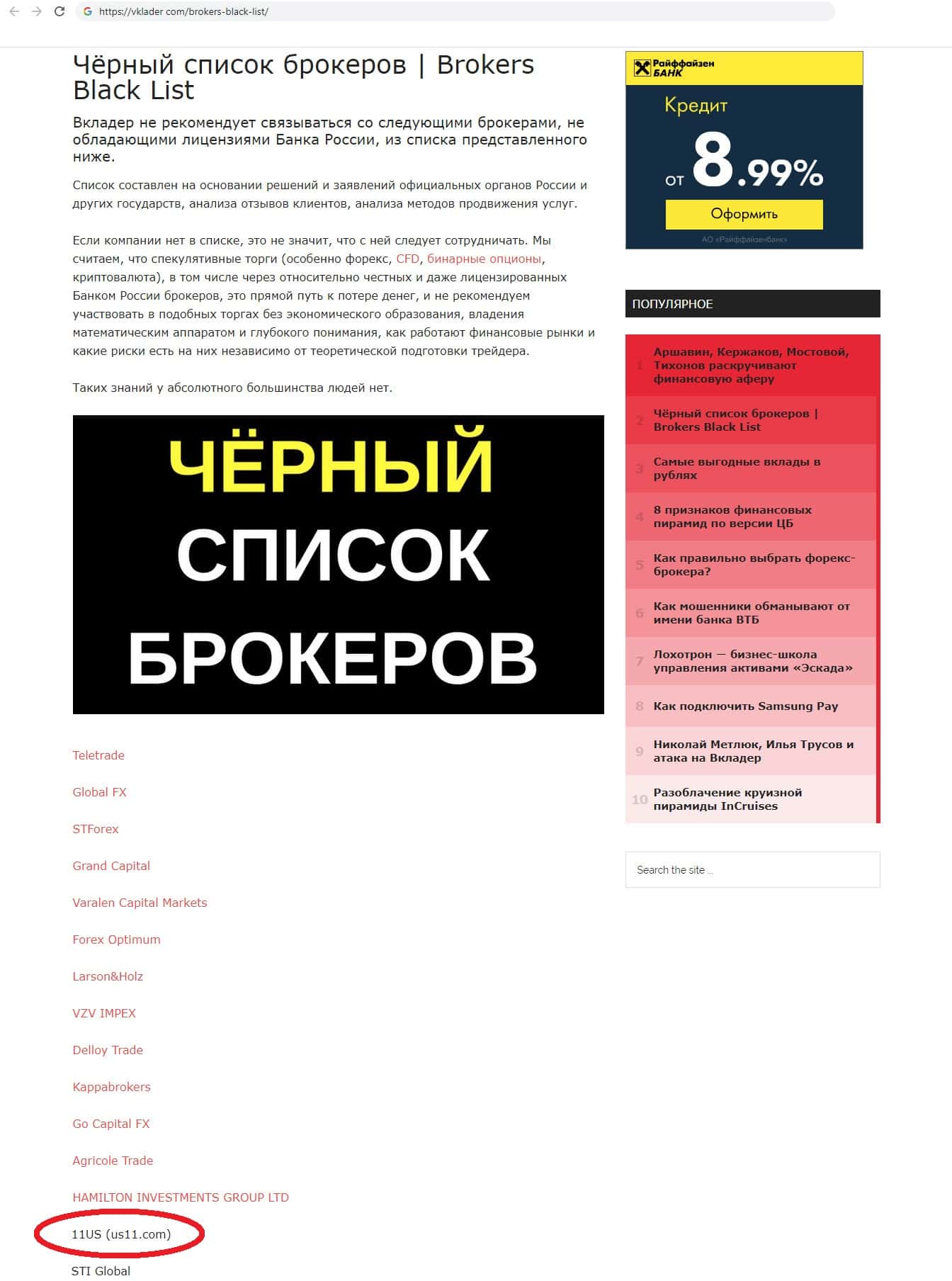 Вот представлено явное доказательство того, что фирма US11 является самыми настоящими жуликами, так как они занесены в чёрный список! В этот список заносятся мошеннические компании, которые признаны таковыми на основании решений и заявлений официальных органов России. Из этого следует, что сотрудничать с компанией опасно.