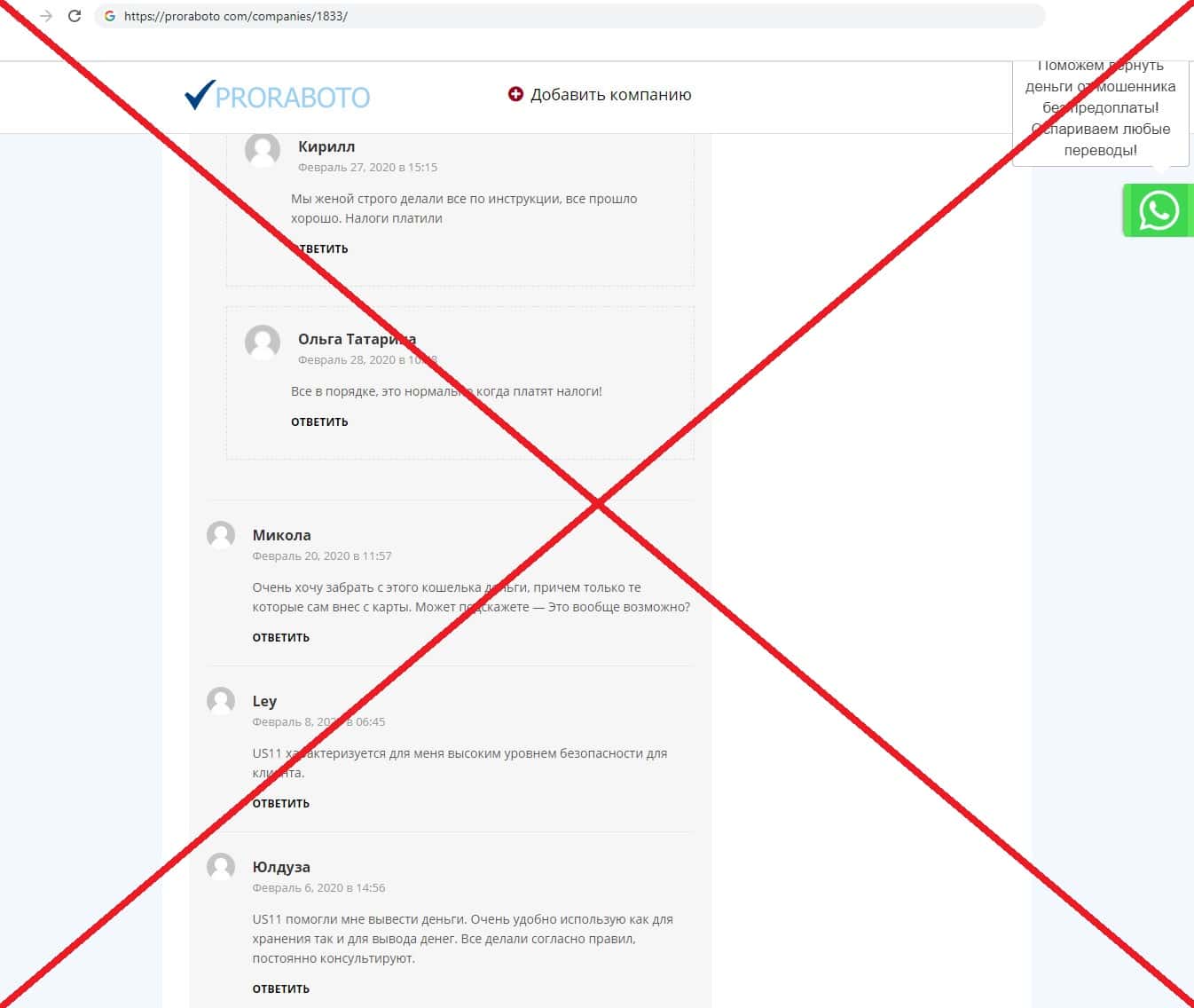 Данные жулики очень следят за своей репутацией, и постоянно удаляют отрицательные отзывы о себе, и вместо них заказывают положительные. Кидалы ЮС11 платят неким пользователям деньги за то, что бы они писали положительные отзывы, такие как в этом примере. В таких отзывах обычно расхваливается контора и указывается какие они замечательные.
