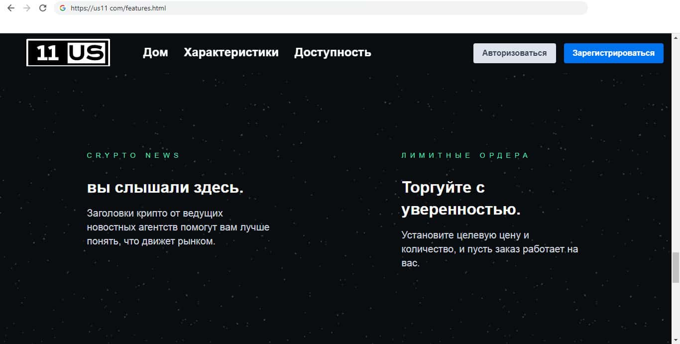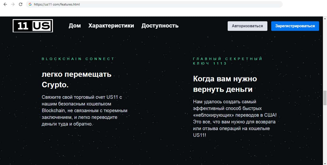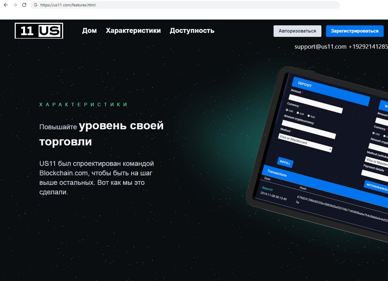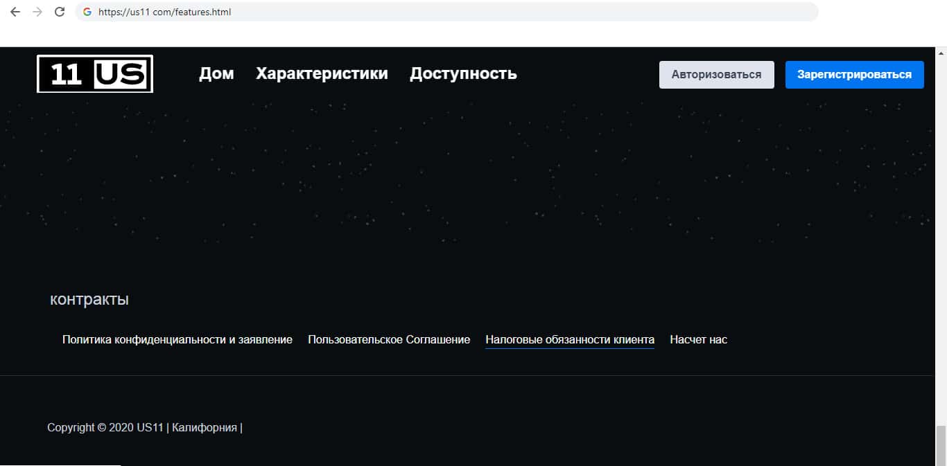 Главный интернет ресурс компании разводил US11 является не более чем просто коммерческий проект, который фирма создала для того, что бы заманивать клиентов выгодными условиями и громкими словами. Сайт создан в тёмном солидном стиле, что должно внушить неопытному пользователю мнимую серьёзность компании.