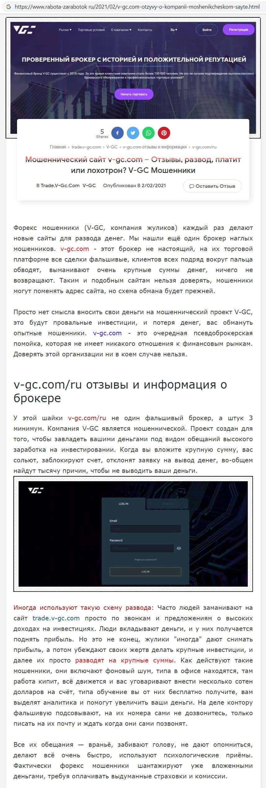 Мы наткнулись на сайт rabota-zarabotok ru, который опубликовал статью о псевдоброкере V GC. Интернет ресурс указал, что компания врёт клиентам что бы завладеть их средствами.