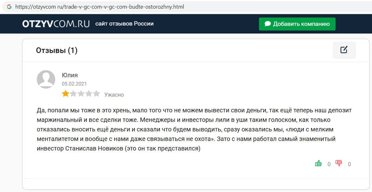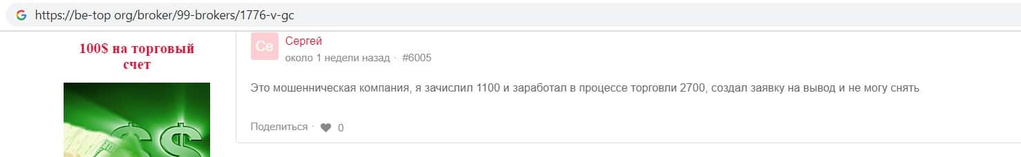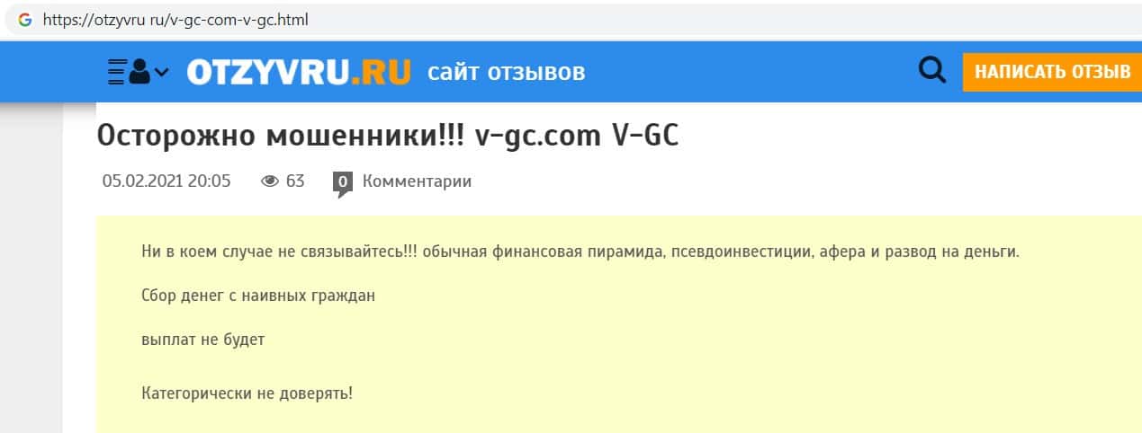 Так же интернет ресурс otzyvru ru призвал интернет пользователей не доверять финансовым кидалам V GC, так как фирма не выводит денежные средства клиентов.