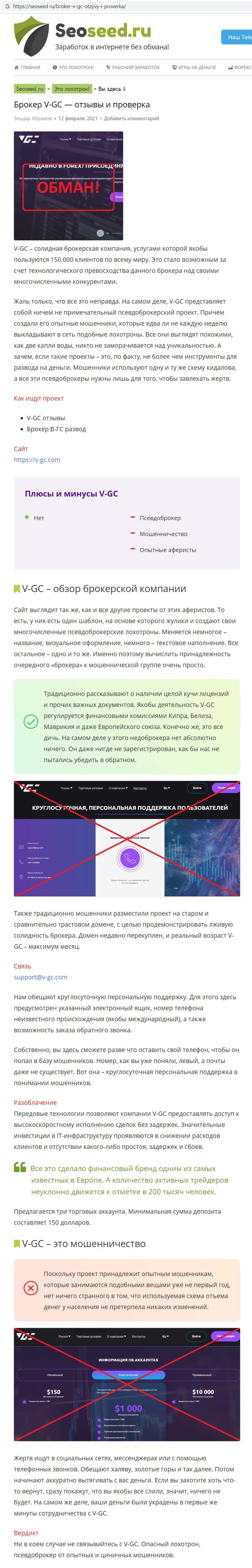 Интернет ресурс seoseed ru написал, что связываться с компанией V GC нельзя, так как они являются очень опасными форекс мошенниками, который разводят наивных пользователей.