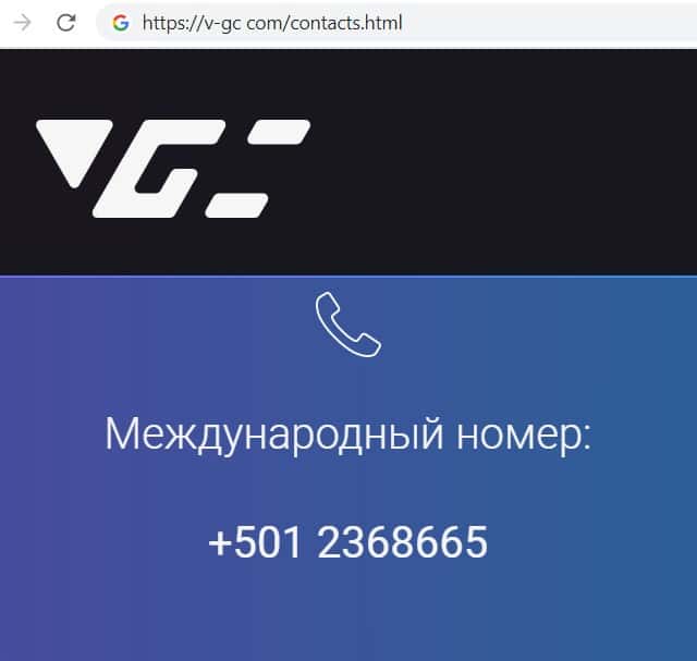Псевдоброкер V GC на своём главном сайте указал контактный номер телефона, с которого сотрудники компании звонят клиентам и выманивают у них денежные средства. Номер кидал: