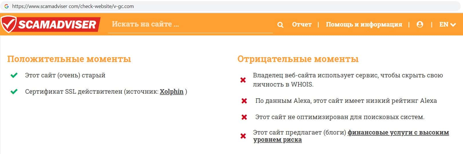 Мнение интернет ресурса scamadviser com о шарашкиной конторе V GC