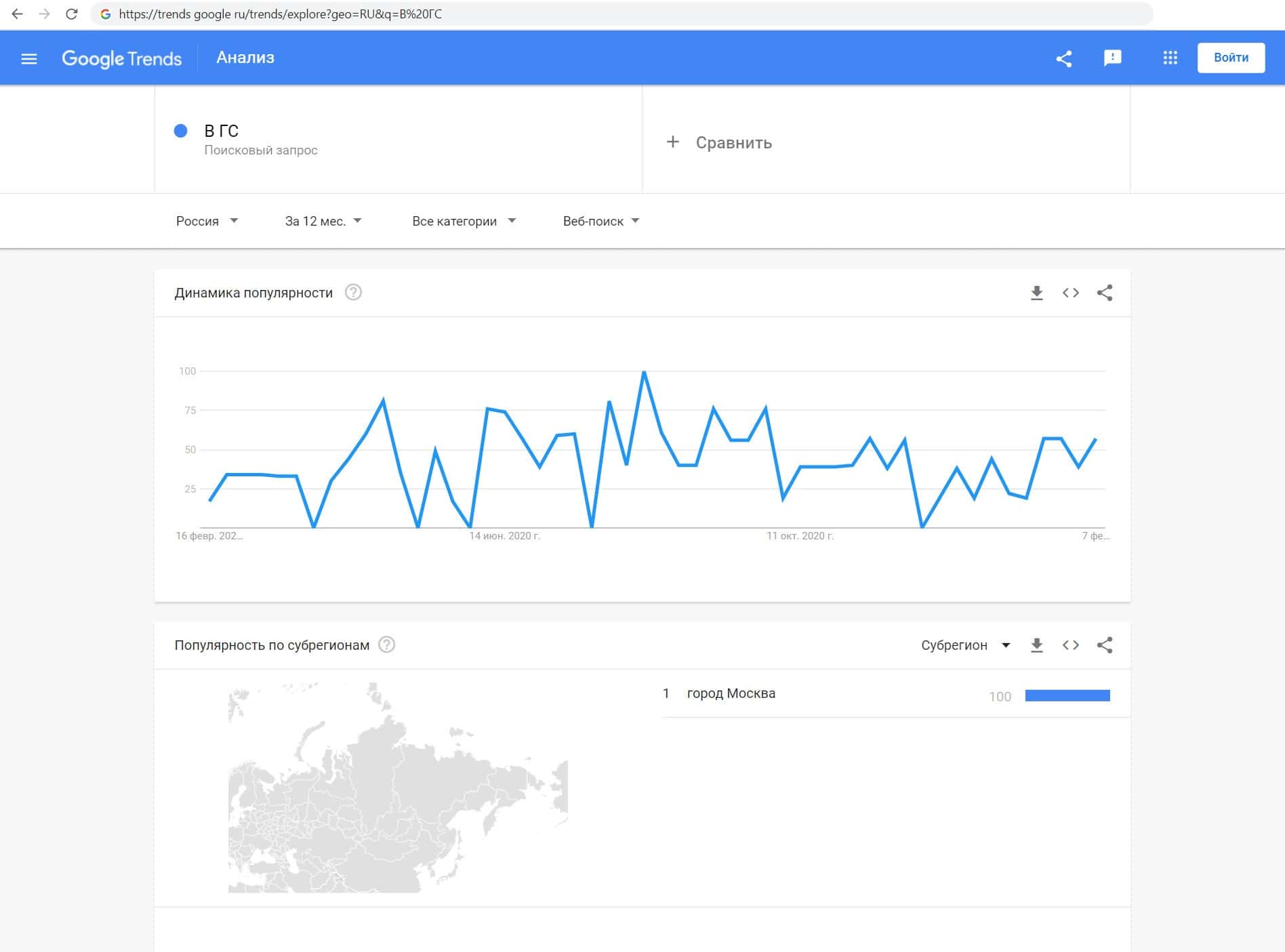 Далее мы проверили количество запросов компании лжеброкера V GC по русскоязычному названию фирмы, а именно "В ГС". Данный запрос выполняли только жители Москвы.