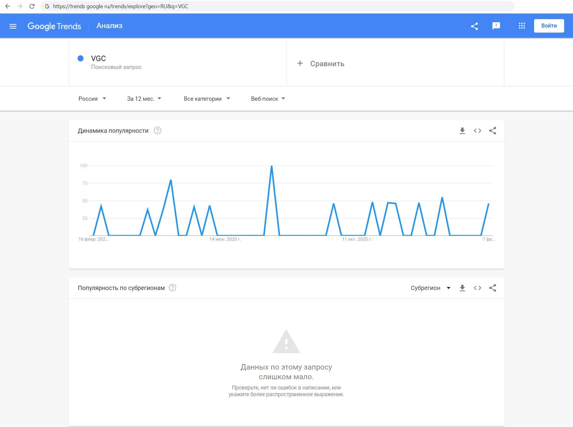 Так же мы проверили количество запросов лохотрона V GC по названию конторы без пробела, а именно "VGC". данный запрос пользователи выполнили не более 100 раз.