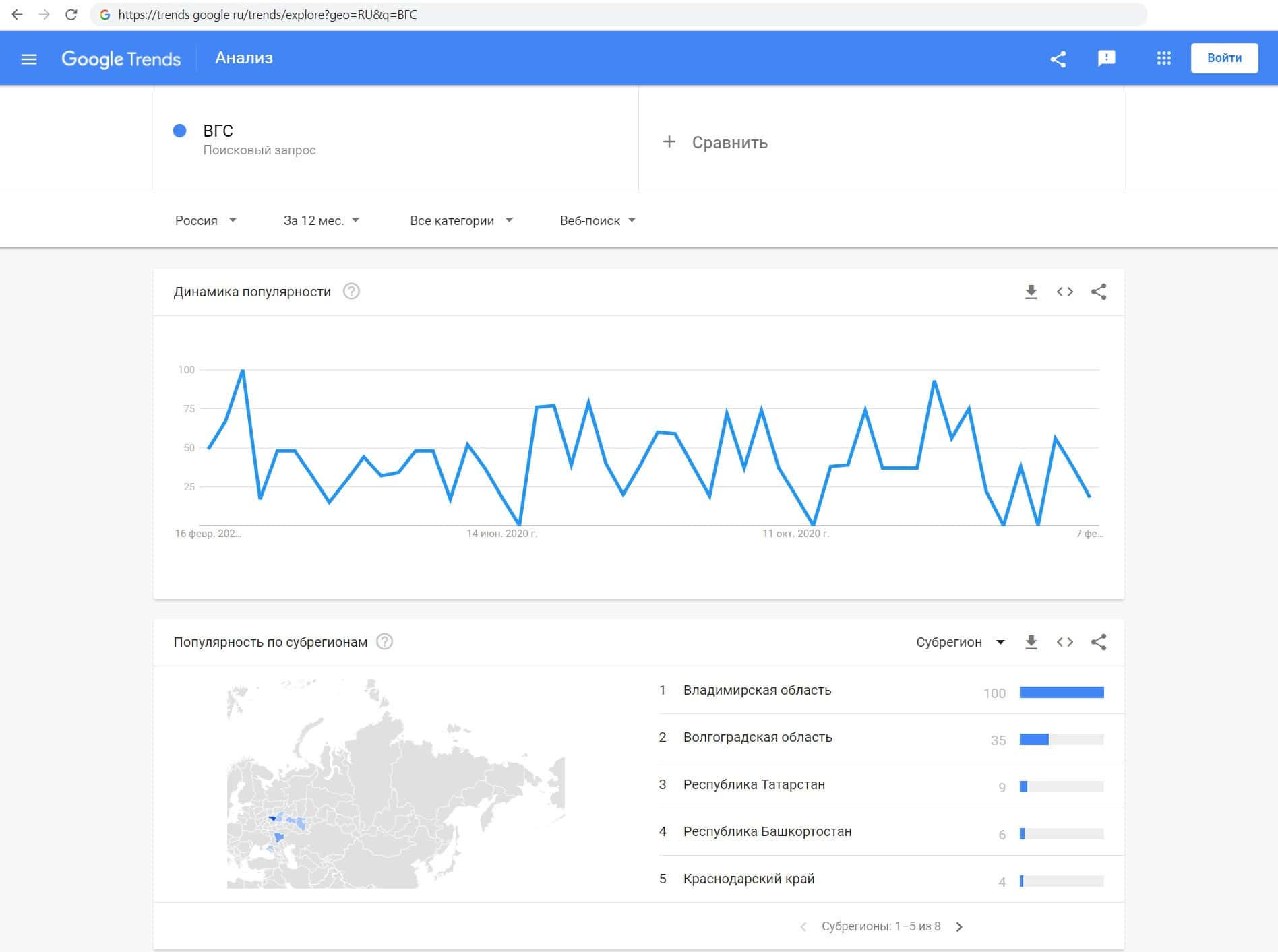 Ещё мы проверили количество запросов конторы кидал В ГС по русскоязычному названию без пробела, а именно "ВГС". Этот запрос выполняли жители Владимирской области.