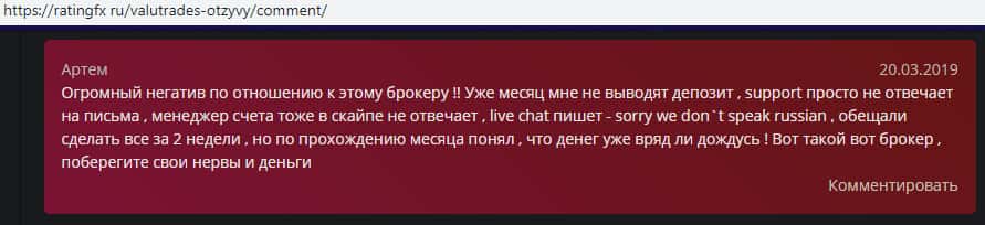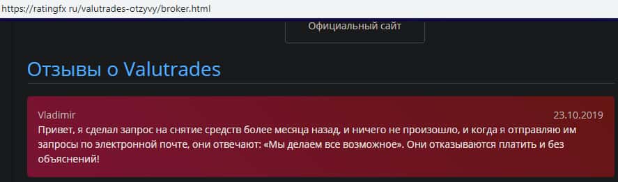 На изображении, расположенном ниже, вы можете наглядно увидеть негативный отзыв в сторону шулеров Valutrades, который связан с тем, что аферисты Валют Трейд попросту не выводят средства очередному наивному пользователю сети интернет, который повелся на сомнительную рекламу жулья Valutrades и по итогу потерял в данной помойке средства.