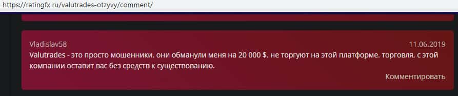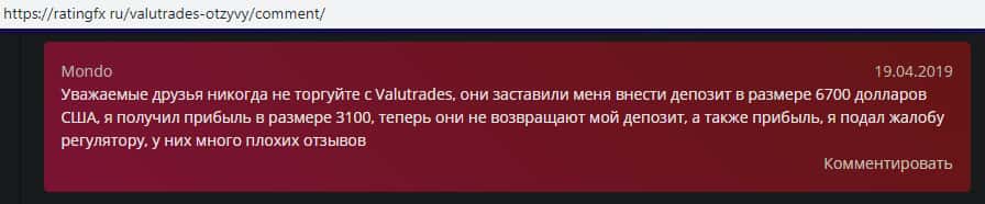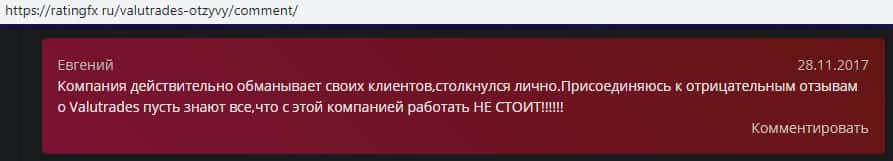 На изображении, расположенном ниже, вы можете наглядно увидеть и прочесть реальный негативный комментарий в сторону шулеров Валют Трейдерс, которые довольно нагло и ожидаемо развели очередного наивного пользователя сети на ввод средств в свою помойку, после чего аферисты Valutrades оперативно дали заднюю и слились с клиентскими деньгами.