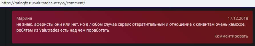 На изображении, расположенном ниже, вы можете наглядно увидеть и прочесть очередной негативный отзыв в сторону аферистов Валют Трейд, который связан с тем, что жулики Valutrades просто нормально не смогли уговорить клиента слить деньги в свою помойку, поэтому аферисты Валют Трейд и попытались развести клиента, но уже с помощью хамства.