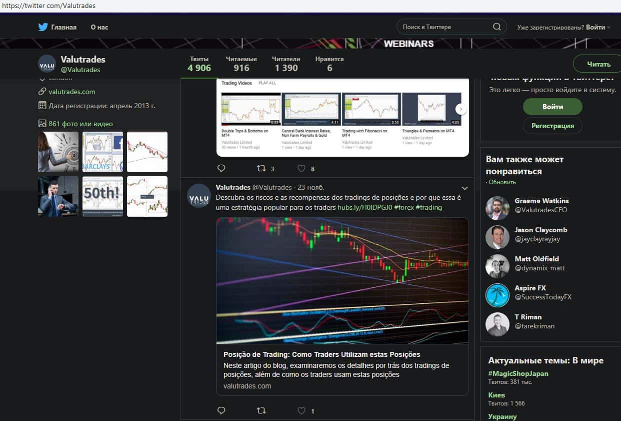 Имеется у аферистов Valutrades и страница в социальной сети Твиттер, где у шулеров Валют Трейд размещена довольно стандартная и типичная лапша на уши и накручено более тысячи подписчиков. На изображении, расположенном ниже, вы можете наглядно увидеть внешний вид страницы аферистов Valutrades в социальной сети Twitter.