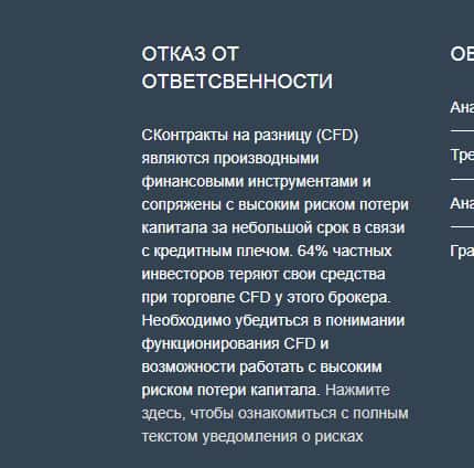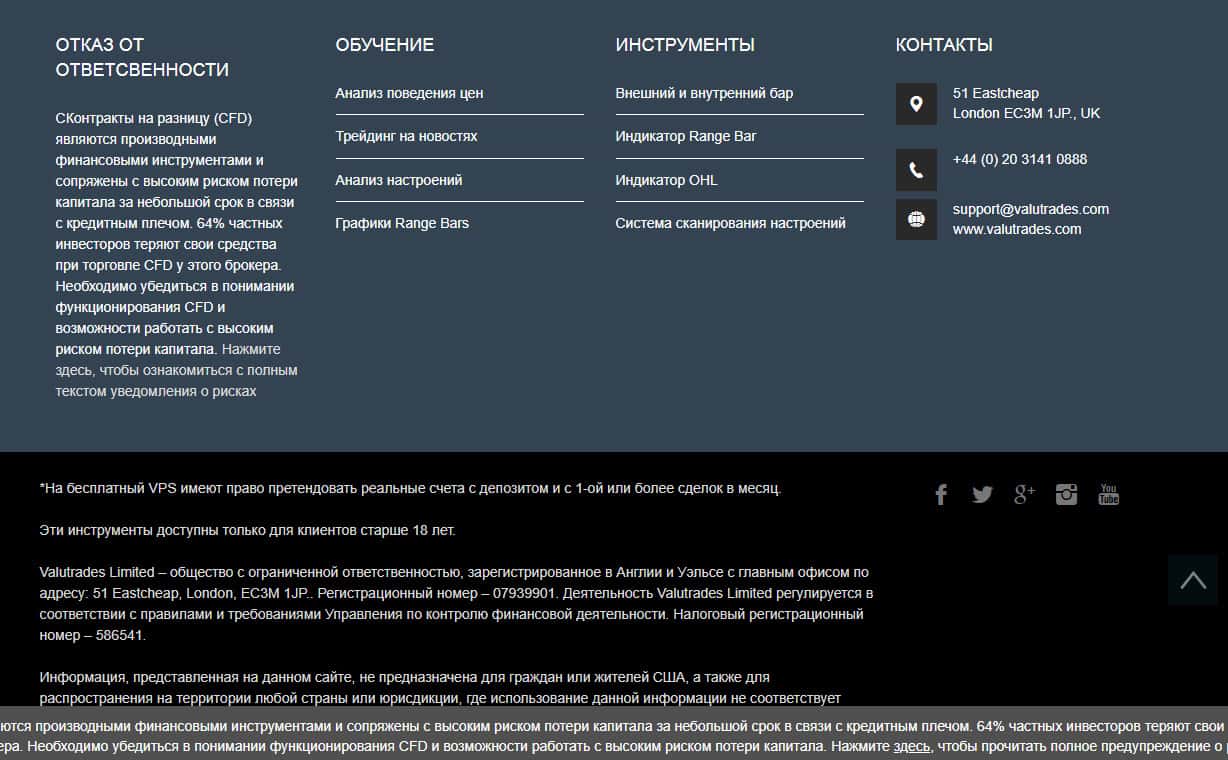 Завершается сайт у жулья Валют Трейд вполне ожидаемо, а именно информацией о том, что шулера Valutrades отказываются за убытки наивной клиентуры, а так же ссылками на различные раздел сайта мошенников Валют Трейд. На изображении, расположенном ниже, вы можете увидеть окончание подвального сайта аферистов Valutrades.