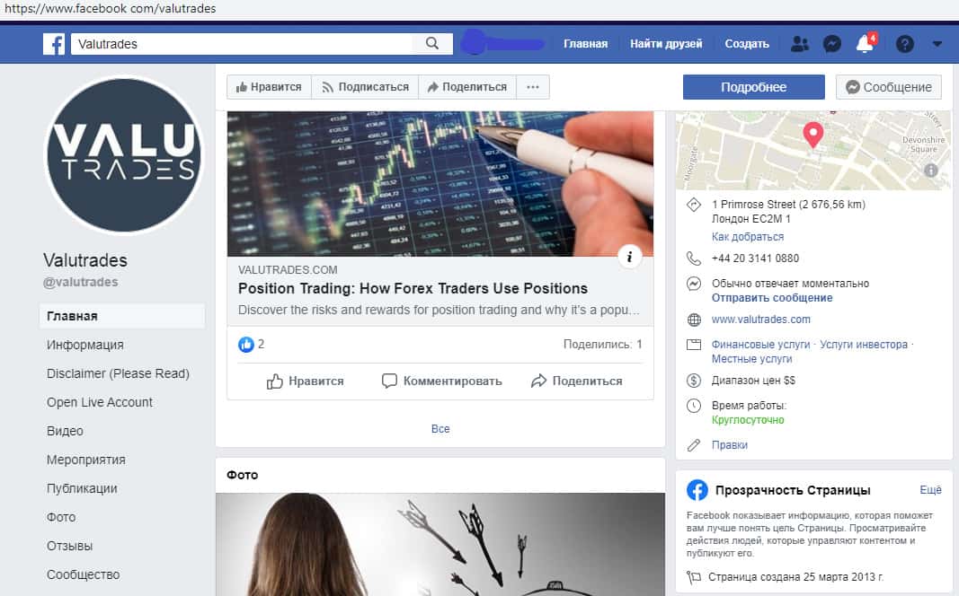 Дабы соответствовать современным трендам шулера Valutrades обзавелись страницами в социальных сетях одной из которых является Facebook, где у мошенников Валют Трейд имеется около десяти тысяч подписчиков. На изображении, расположенном ниже, вы можете увидеть внешний вид страницы проходимцев Valutrades в социальной сети Фейсбук.