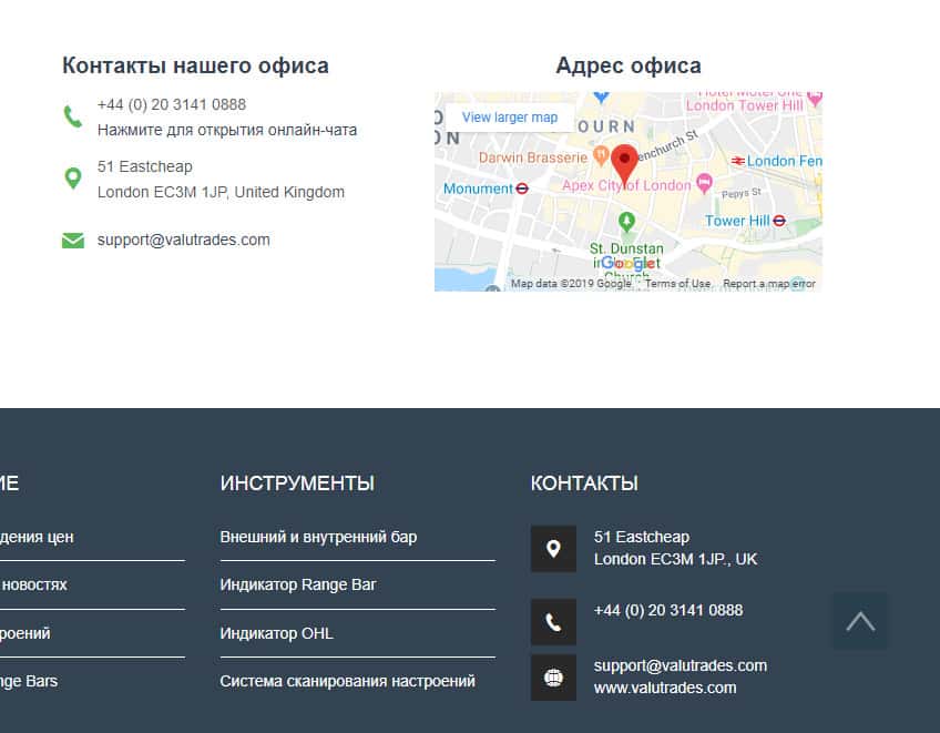 Под свои контакты проходимцы Валют Трейд не отводили отдельный раздел, а попросту указали их в конце своего подвального сайта, что явно говорит об определенной халтуре со стороны шулеров Valutrades, или же их наглом и банальном нежелании общаться со своей потенциальной клиентурой. Итак ниже перечислим контакты аферистов Валют Трейд: