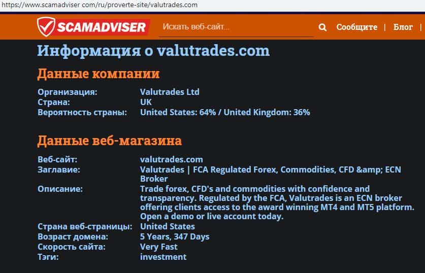 В связи с мошеннической и противозаконной деятельностью лохотрона Валют Трейд его реальные руководители предпочитают анонимность дабы избежать ответственности со стороны правоохранительных органов. Техническую же информацию о сайте жулья Valutrades можно узнать непосредственно с помощью портала scamadviser com, что вы можете увидеть ниже.