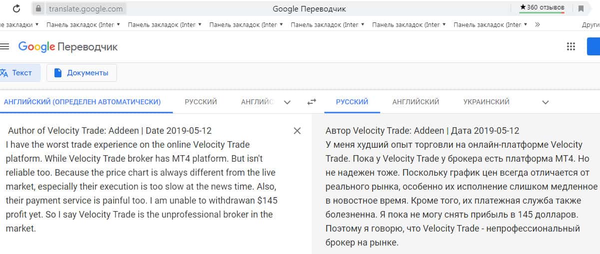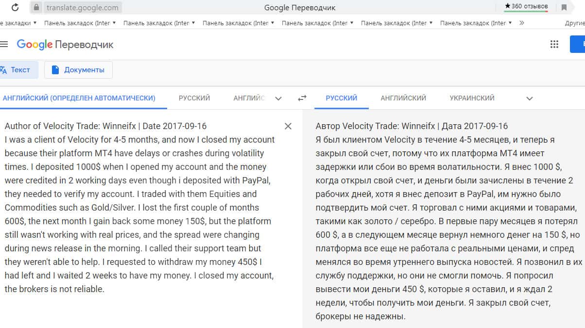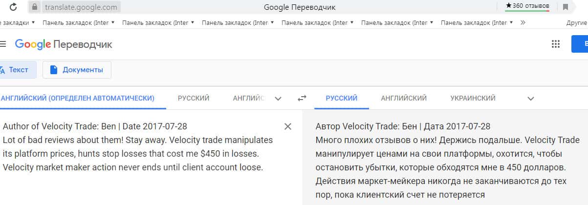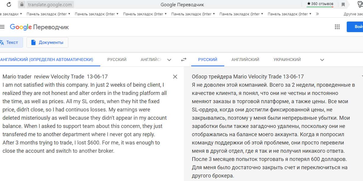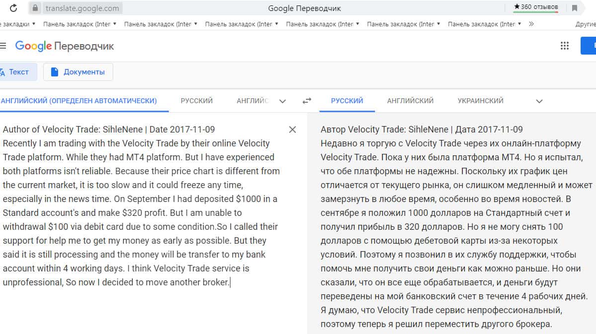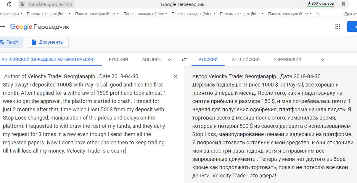 Перевод отзыва о жуликах Velocity Trade сделан на сайте translate.google com.