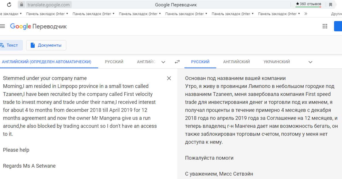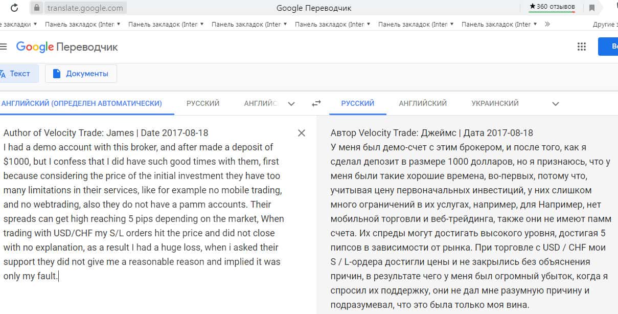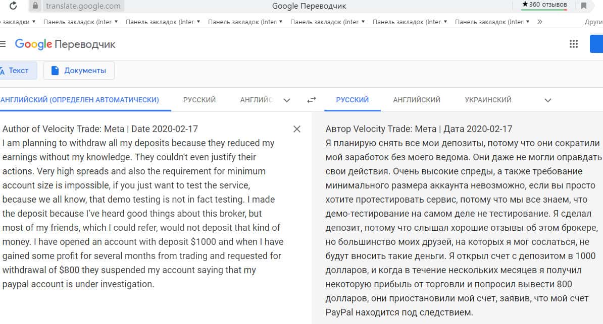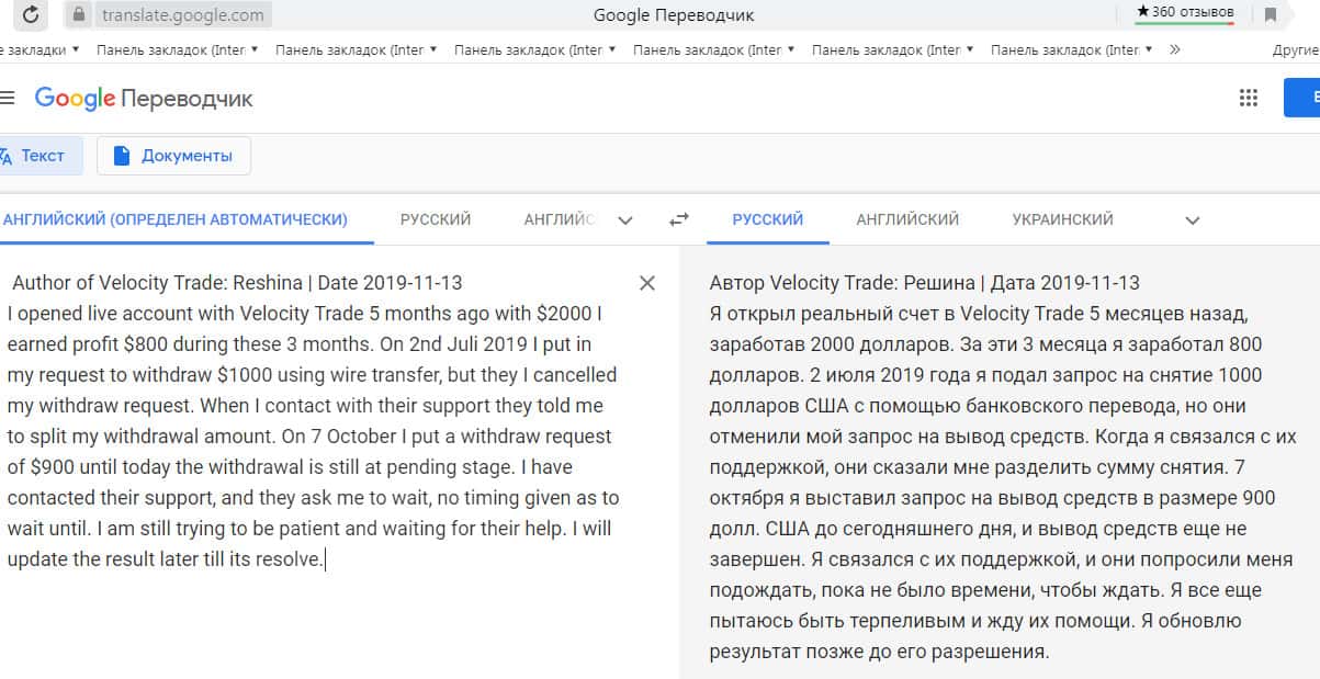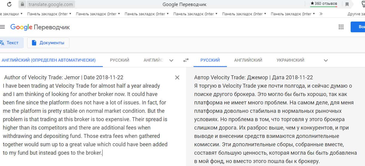 Перевод отзыва о жуликах Velocity Trade сделан на сайте translate.google com.