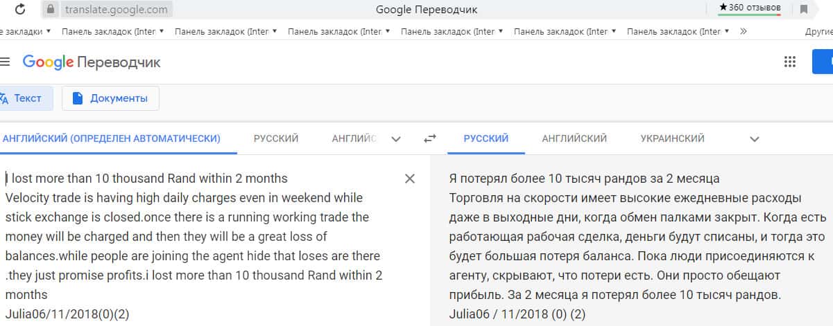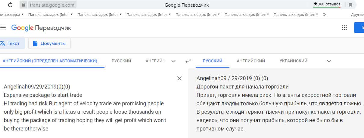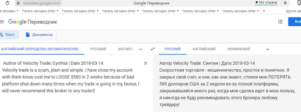 Перевод отзыва о шаражке Velocity Trade сделан на сайте translate.google com.